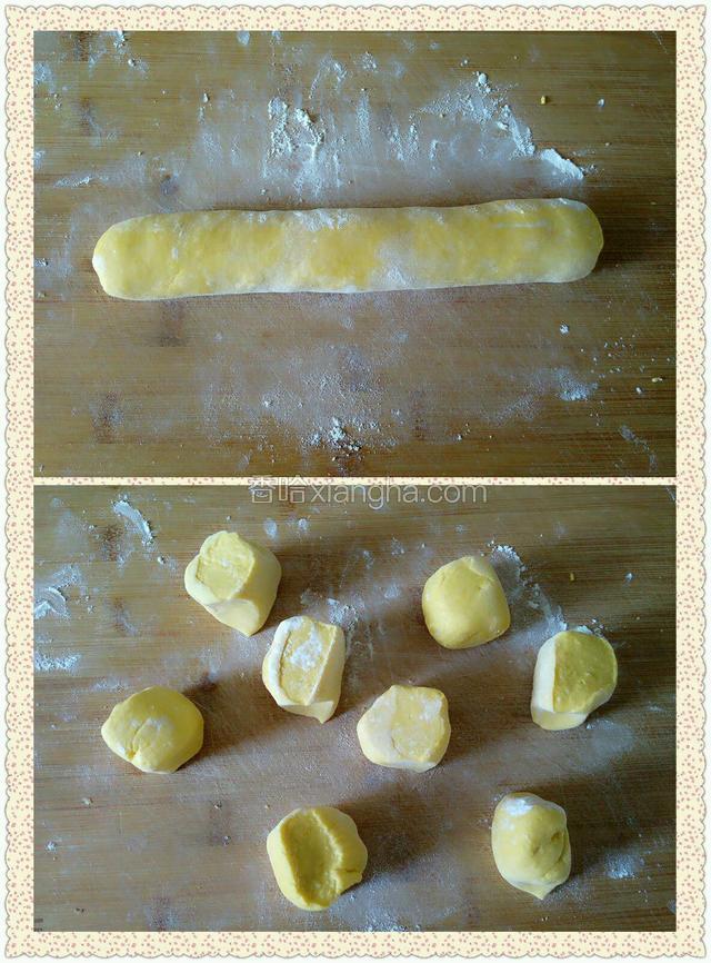 6.将面团揉成条状,再分成若干个小剂子,每个大约40~50克,揉成团