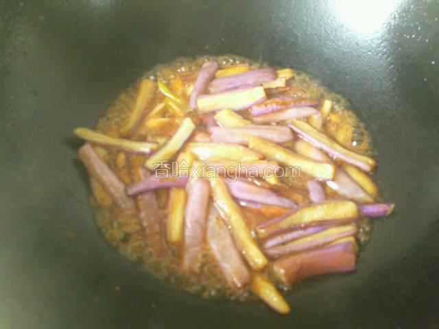 5.开大火,锅热后放入油,等油热后将茄子放入油锅中炸熟。