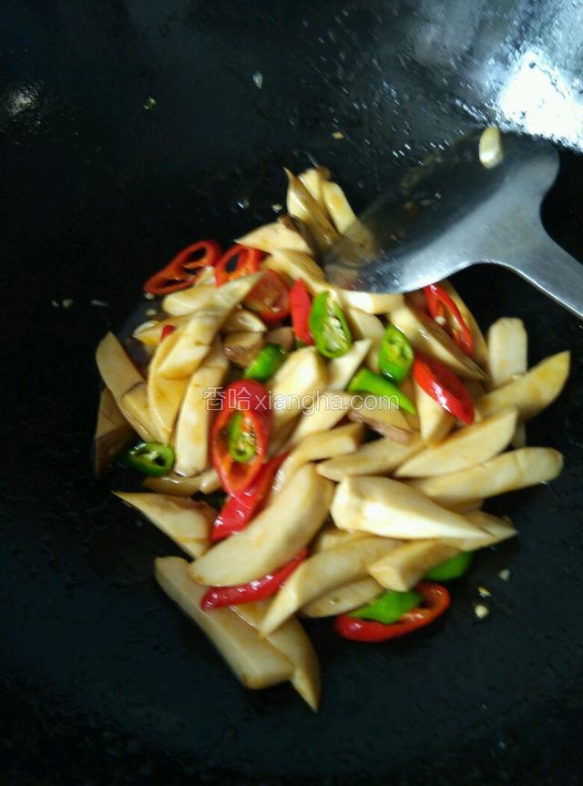 4.下青红椒,加少许生抽、味精翻炒均匀。
