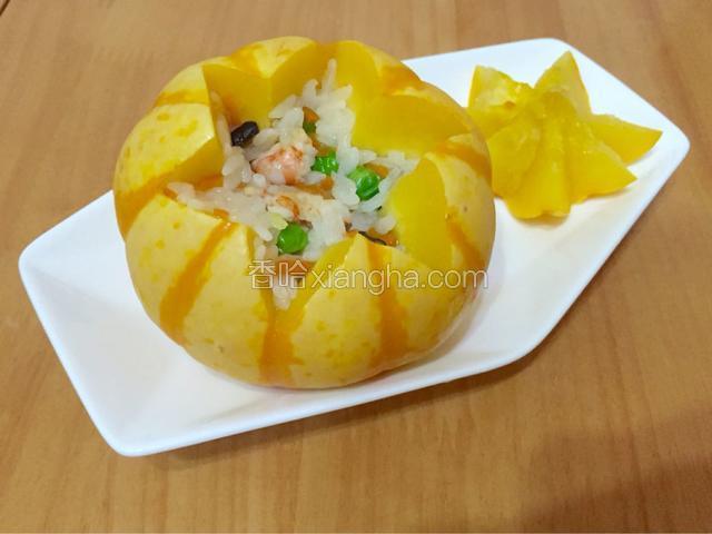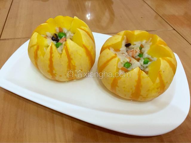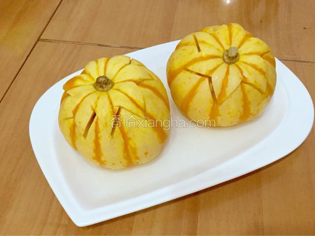 1.先将小南瓜挖好,做出一个盖子,在南瓜的三分之一处挖。
