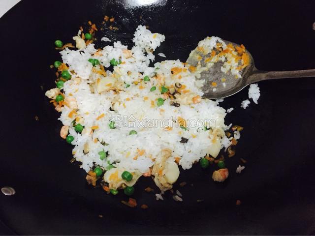 4.锅里放入香菇,豌豆,胡萝卜,扇贝,虾仁粒一起翻炒。