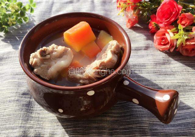 5.排骨炖至一个小时后加入木瓜大火煮八分钟