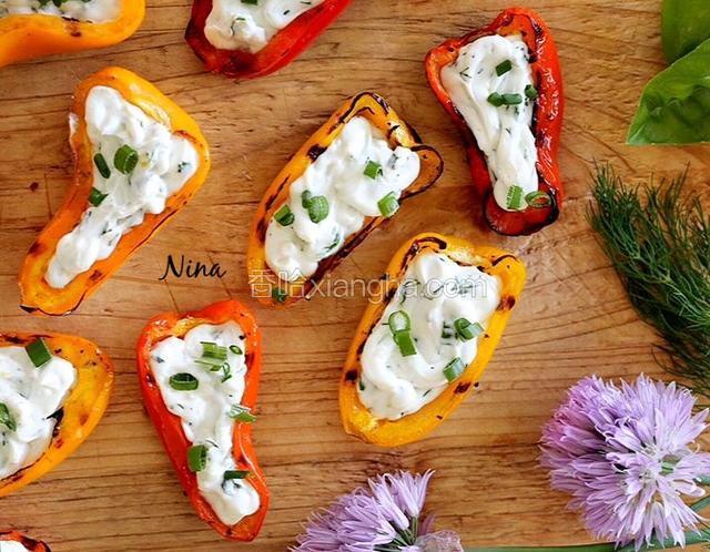 6.挤入烤好的彩椒内,表面再撒点葱花装饰一下,一道颜值高又美味的开胃菜就完成了。 Bon appetite.