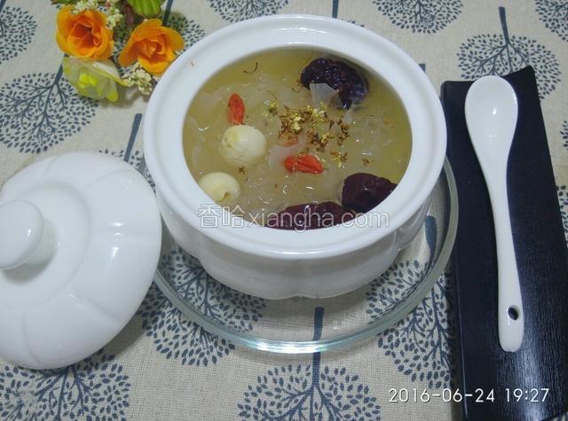 3.大约纯三 十分钟,以莲子绵软为标准,放入冰糖再炖5分钟。