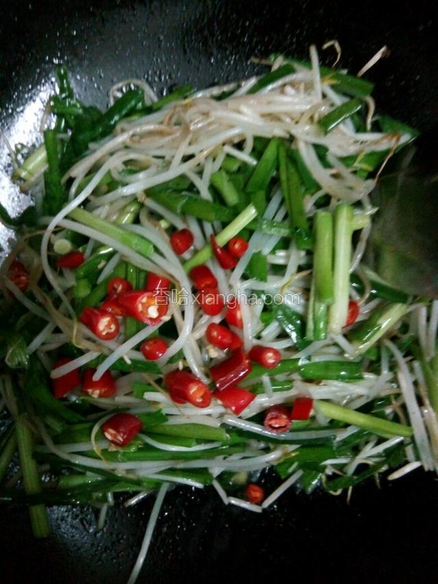5.再加入小米椒,继续翻炒。炒韭菜就不要炒太久了,大火八秒就足够了。再加入适量盐,适量五香粉,翻炒均匀就可以起锅了。