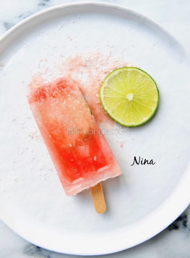 2.冰模中放入一片柠檬片,然后倒入西瓜鸡尾酒,满模,入冰箱冷冻5小时以上。