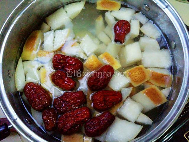 3.大火烧水,烧开后加入雪梨煮10分钟