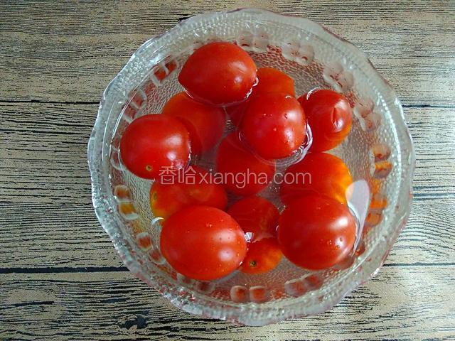 3.取一个圣女果,在圣女果的1/3处直向切开。