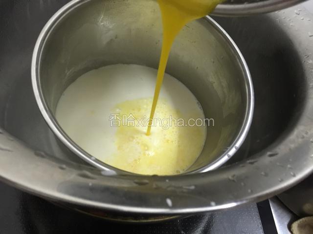 3.牛奶加热加入吉利丁至完全融化.加入蛋黄液顺势搅拌黏稠离火