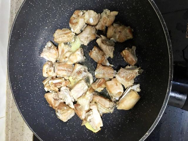 3.锅内加油七成热入生姜,倒入排骨,翻炒至双面焦黄。