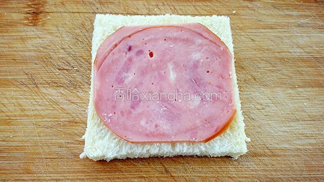 3.取一片吐司,把火腿切去边角,盖在吐司上。