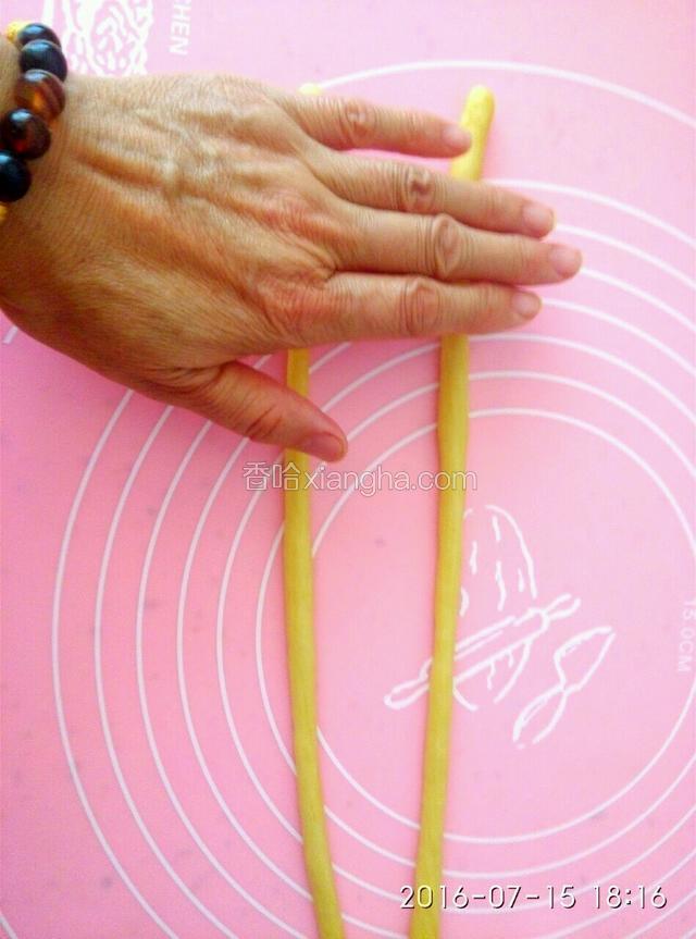 12.这样面就形成了一个完整的绳子状。然后一手向前搓,一手向后搓,让绳子拧得更紧。这时的面,大约有40-45公分长。