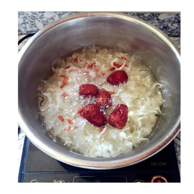 4.将小朵银耳倒入煮沸的水中继续熬煮,时间为40分钟