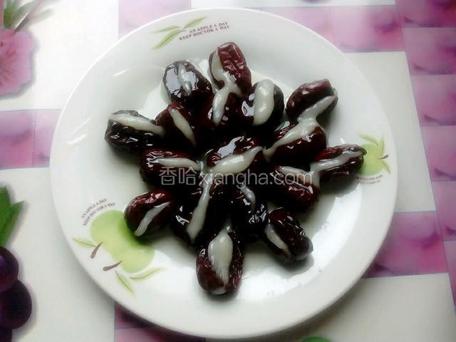 4.再把泡好的红枣用刀从中间切开(不要切断)去掉瓠