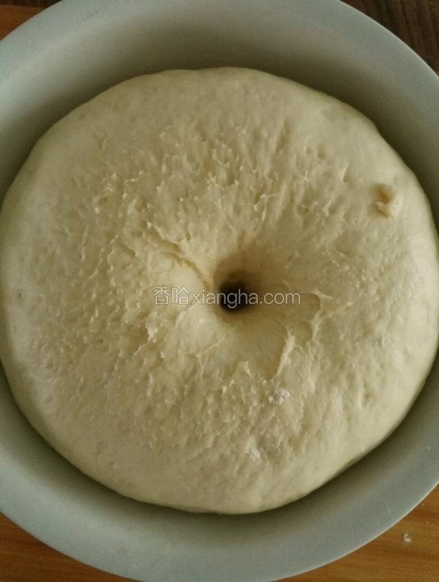 4.把揉好的面团放到温暖处发酵至2倍大,发好后用手指蘸面粉戳一下不回缩证明以发酵好