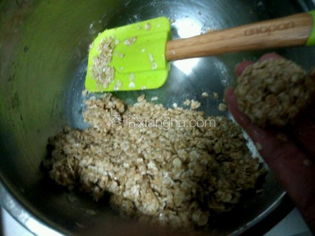 5.烤箱预热,160度,然后将麦片团分成大小差不多剂子用手搓圆,再压扁,放入烤盘上烤15分钟左右关火再焖三分钟取出晾凉。