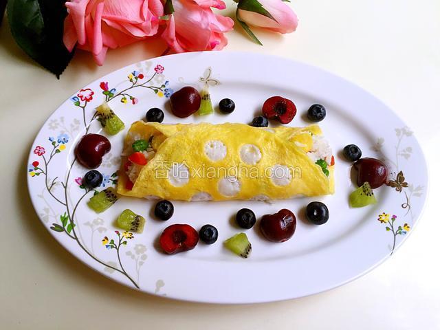 5.取裱花嘴在蛋饼上盖出小圈圈,取下的蛋皮放入红萝卜、青豆碗中