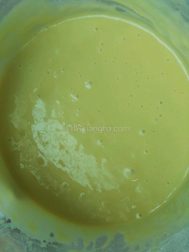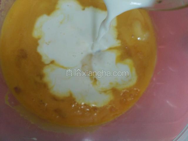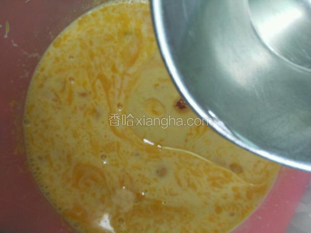 5. 分两次加入玉米油,与蛋黄液搅打均匀,注意不要将蛋黄打发了
