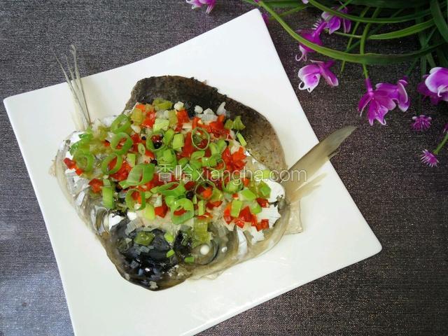 6.蒸好的鱼取出,上面撒上葱花,倒一勺豉油,锅中烧热油浇在葱花上,葱香味就出来了