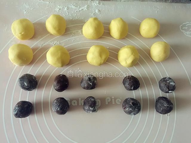 4.把面团滚成长条,分成若干个剂子,每个剂子30g,豆沙馅15g,揉成圆球。