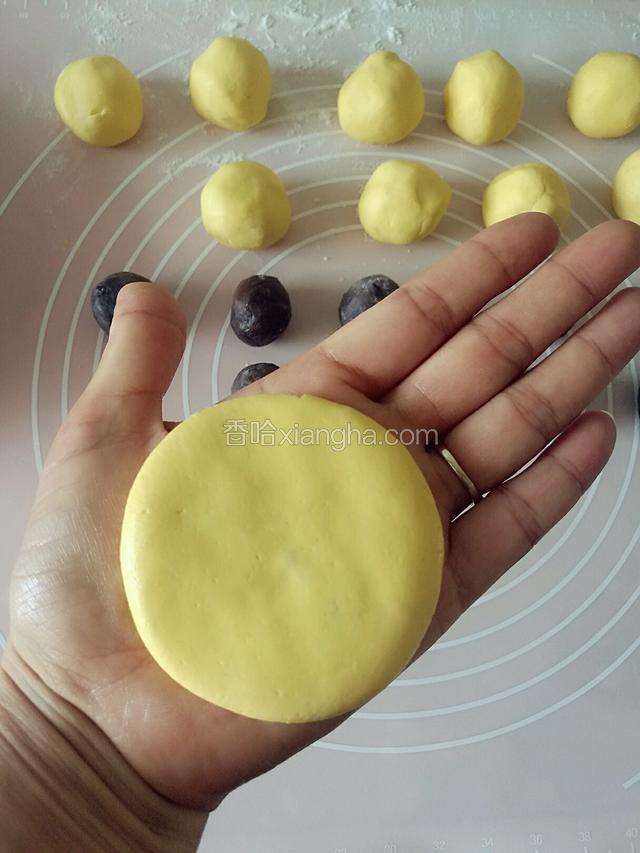 5.取一个小圆面团放在左手上,用右手大拇指按压成饼,把豆沙馅放在面饼上。面粘手就往掌心抹点油。