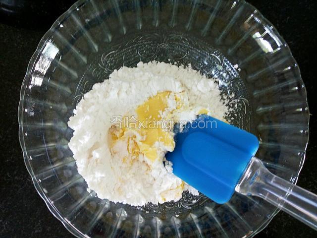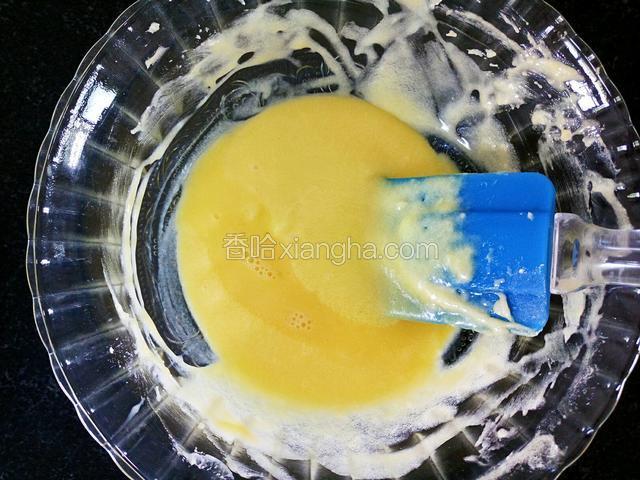 3.蛋液40g分三次加入拌匀,牛奶40g分三次加入拌匀。