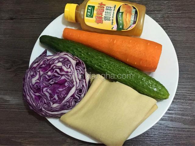 1.黄瓜,胡萝卜,紫甘蓝,豆皮,太太乐鲜鸡汁备用