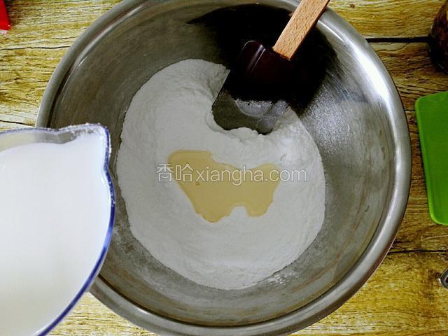 3.然后把冰皮粉和炼乳一同放入盆中,分次倒入牛奶。