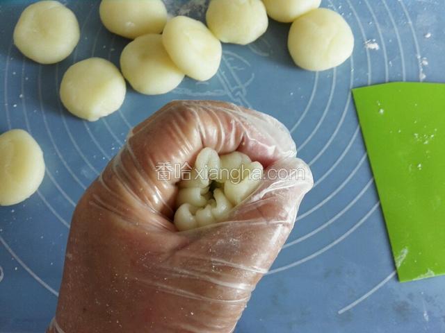 2.果味馅料提前做好,称重20克左右小剂子揉园备用,馅料制做过程参考上传(果味月饼馅)