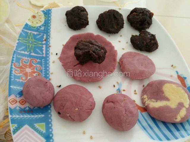 4.然后用手团成团。做成枣泥馅,我的图中那个是用筷子压了两下,让大家看清楚
