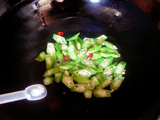 2.锅中加适量的水加一点点的油和盐放入黄秋葵焯至半熟