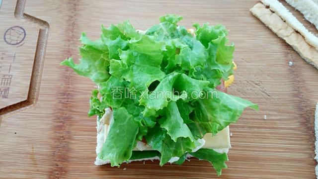 6.依次放上生菜和火腿切片,然后挤适量番茄酱。