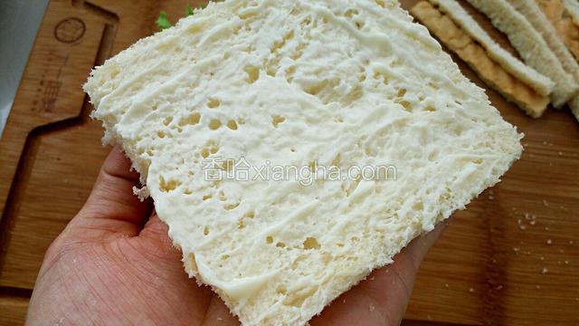 5.在其中一片吐司上涂满沙拉酱。
