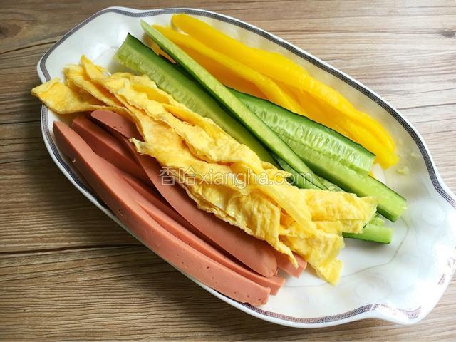 2.鸡蛋液倒入锅中,煎成蛋皮,放置温热后切条。