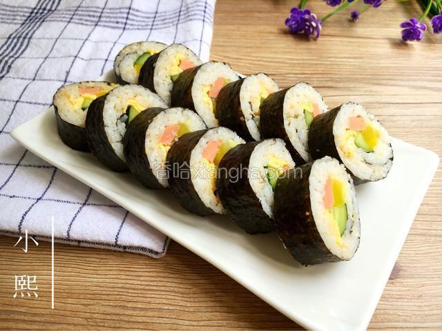 6.用饭勺将米饭均匀平铺在紫菜上但不要太厚,最后留一节手指长的紫菜不要铺米饭,留着封口用。
