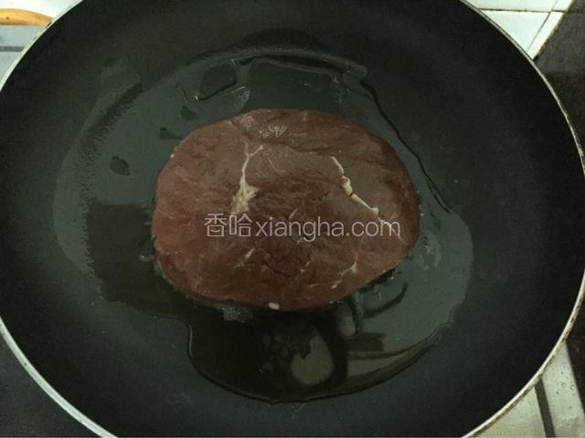 3.平底锅倒入适量黄油烧至六七成热时放入牛排,小火煎3-4分钟