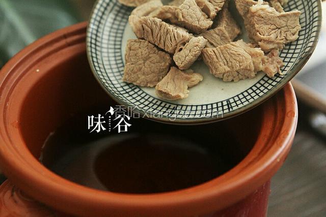 2.牛肉切小块,用滚水煮一下,撇去血沫 后用冷水冲洗干净。