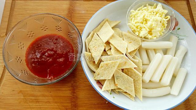 1.准备好所需食材,把年糕条洗净备用,鱼饼切菱形片。