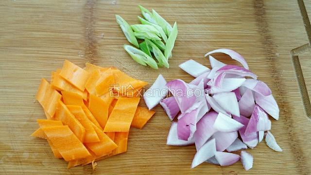 2.把洋葱和胡萝卜切片,大葱切葱花。
