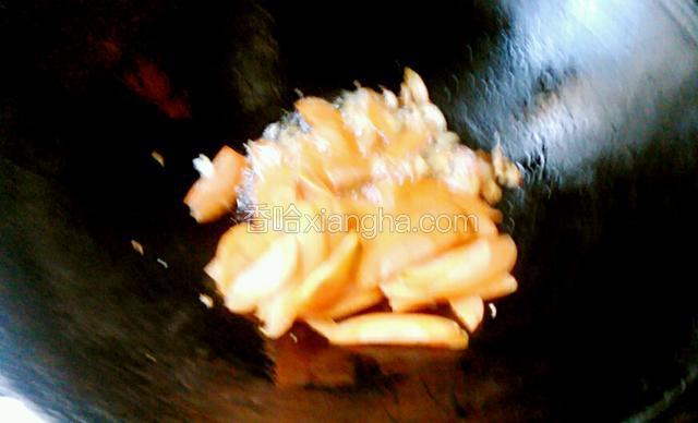 5.加入生姜,大蒜末炒香加入红萝卜煎炒断生。