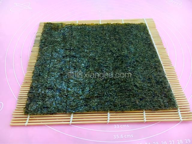 4.寿司帘洗净擦干放在干净的砧板上 紫菜光滑面向下粗糙面向上放在寿司帘上