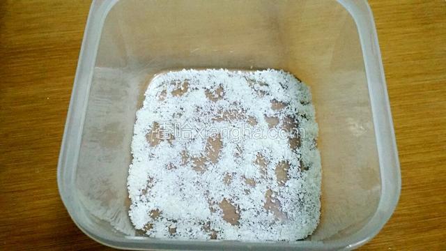 2.准备一个保鲜盒,在盒底撒上适量椰蓉备用。