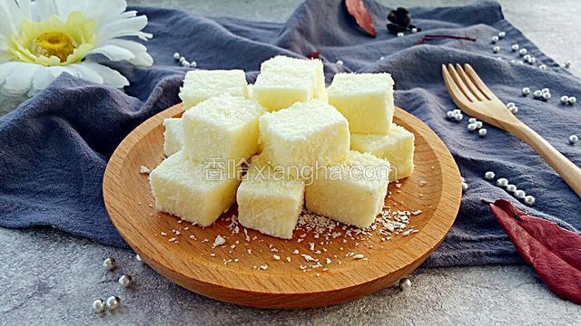 6.倒入铺有椰蓉的保鲜盒中晾凉后放入冰箱冷藏四小时以上。
