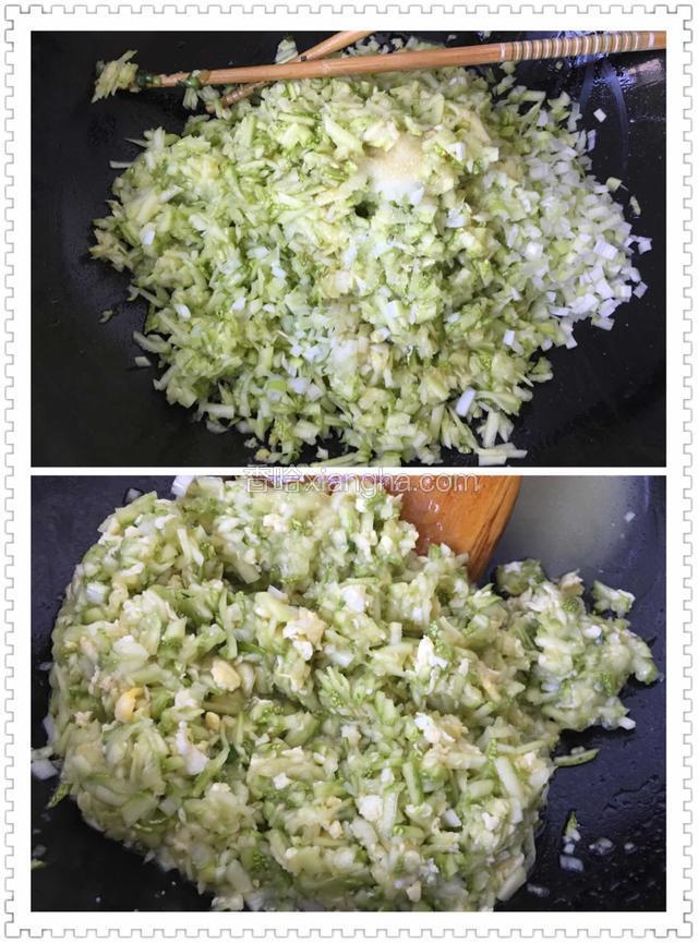 5.鸡蛋碎变凉时,放入葱花和西葫芦碎,再依次放入玉米油、香油和盐,搅拌均匀备用。