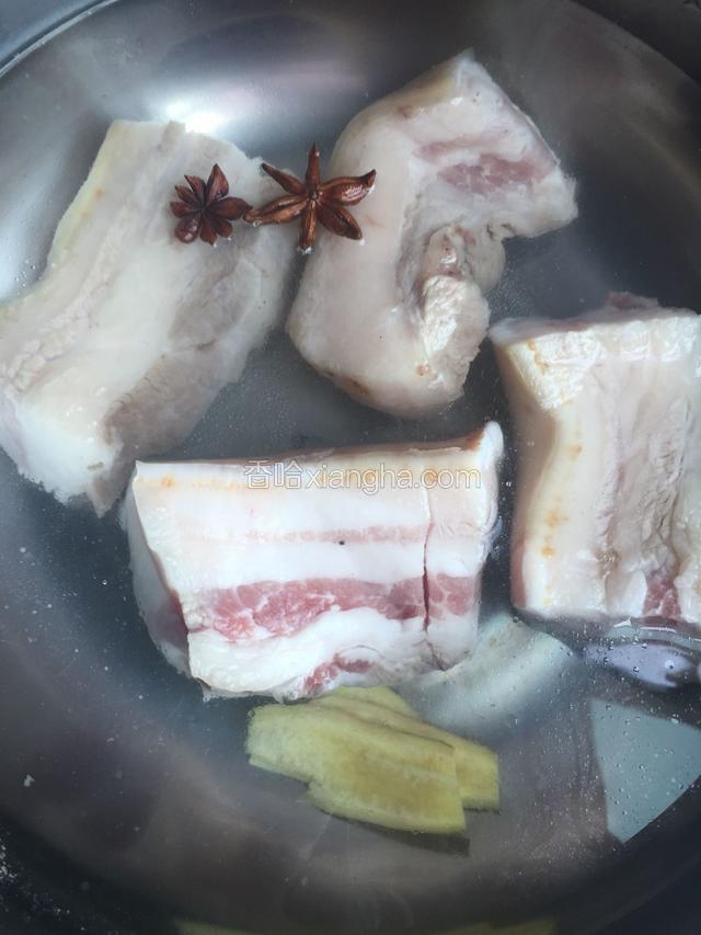 1.把五花肉切成段放入锅中加入八角生姜清水煮至十五分钟捞出沥干水分