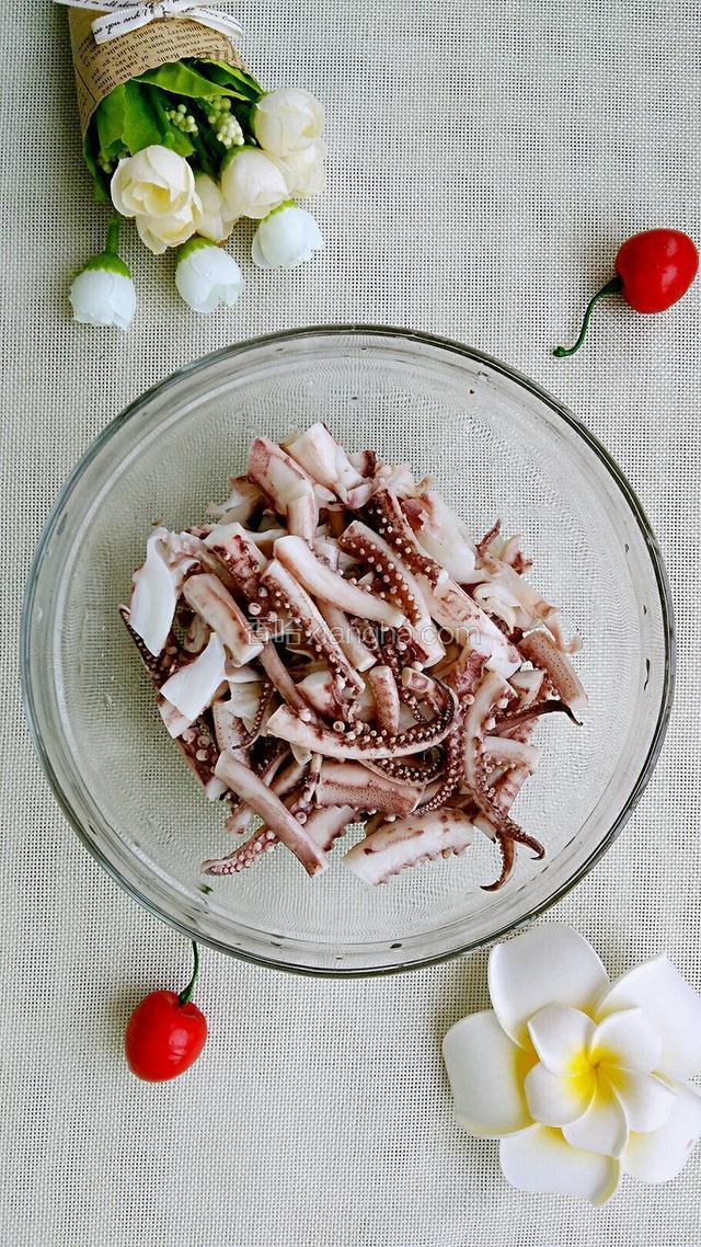 1.鱿鱼须洗干净,放入沸水锅中焯水,捞出后用清水冲洗干净。