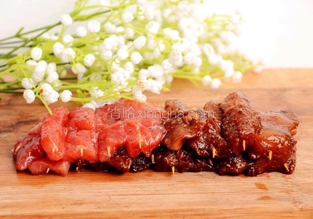 5.腌制好的拿出来,串上牙签,我有几块是牛肉。