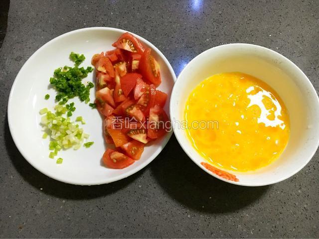 2.西红柿去皮切块,葱切末,鸡蛋打散备用。
