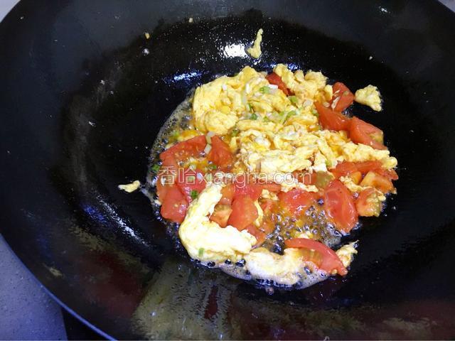 6.西红柿炒熟以后,加入炒好的鸡蛋,翻炒均匀,加入适量的盐调味,倒入少许生抽炒匀。