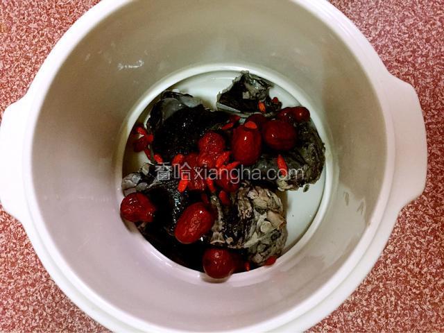 3.把乌鸡、红枣、枸杞放入炖盅里